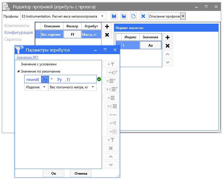 1) Подсчет веса металлопроката: «вес погонного метра» умножается на «длину изделия» и это значение записывается в атрибут (см UniON_ves_metalla.avi), там же показаны настройки профиля.