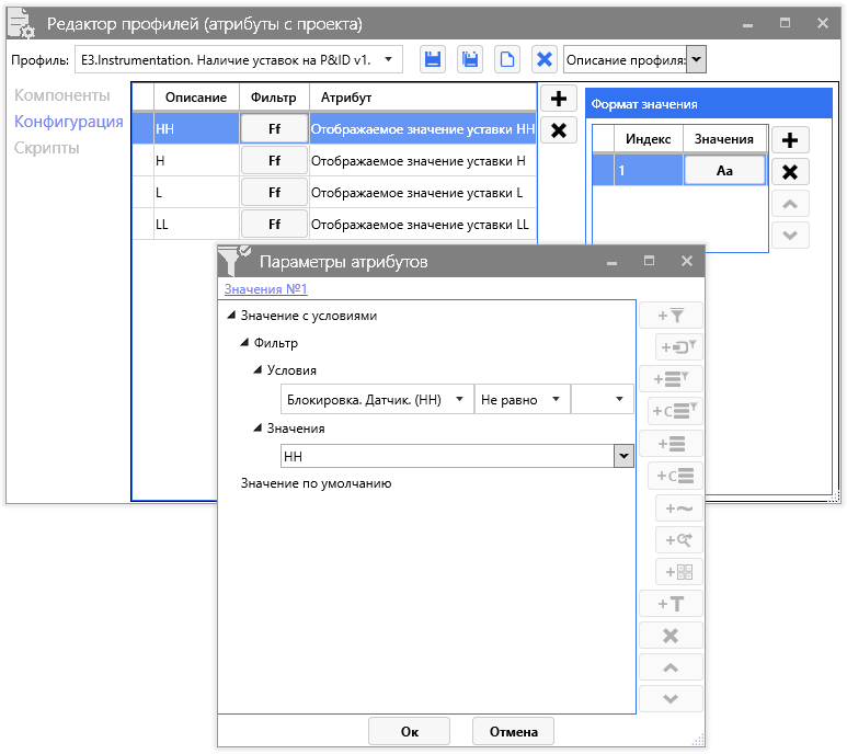 На примере блокировки по верхнему уровню (HH) – Если у изделия есть не пустое значение атрибута: «Блокировка. Датчик. (HH)», то записать в атрибут «Отображаемое значение уставки HH» значение «HH». (см UniON_PID_ustavki.avi)